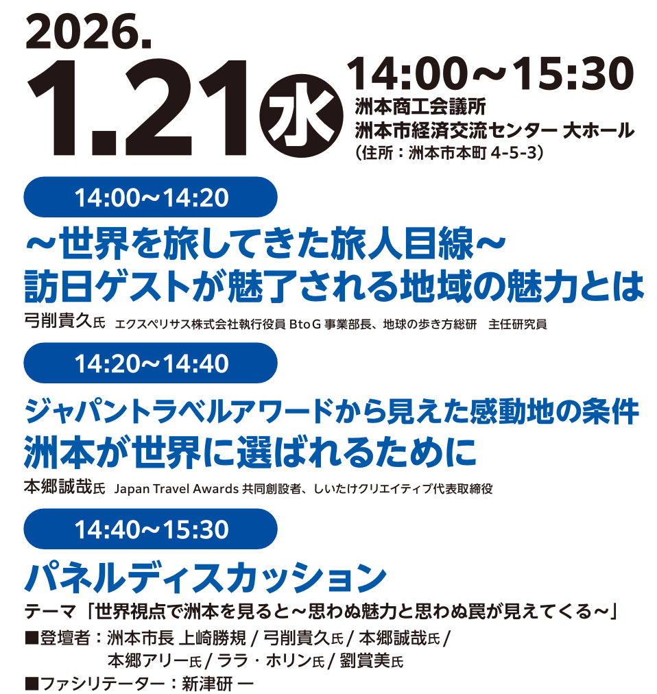 参加費:無料対象者:洲本市に在住・在勤・通学の皆様主催:洲本市商工観光課 ■申込受付終了日:1月20日(火)12:00まで※受付は先着順となります。期間内であっても定員に達し次第、受付を終了いたします。